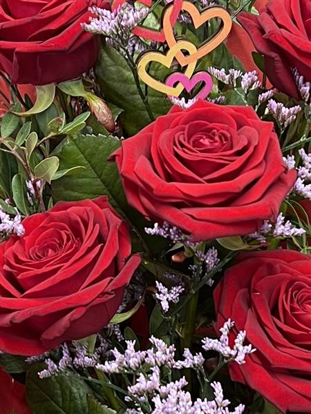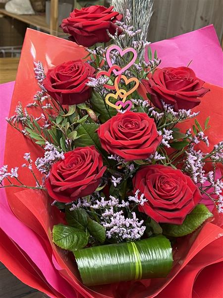 6 Luscious Red Naomi roses with pampas grass, purple Limonium, foliage and a heart pick all gift wrapped and in water in a box for instant display.