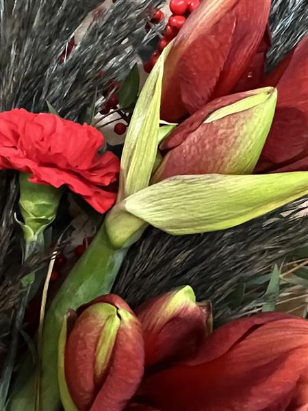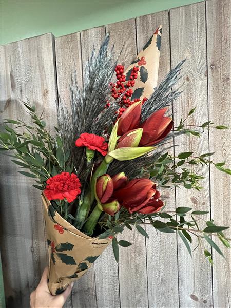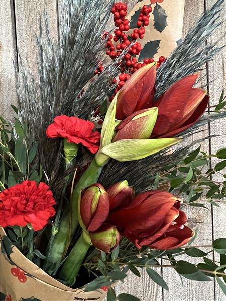Stunning Amaryllis with Ilex berries, Vibrant Red Carnations, Coloured Pampas Grass and Eucalyptus make this gift a Christmas favourite. beautifully wrapped.