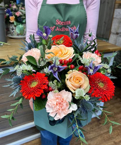 Lovely peaches and reds with thistles, clematis and hypericum berries, eucalyptus and astrantia flower arranged in flower foam in a bluey coloured hatbox