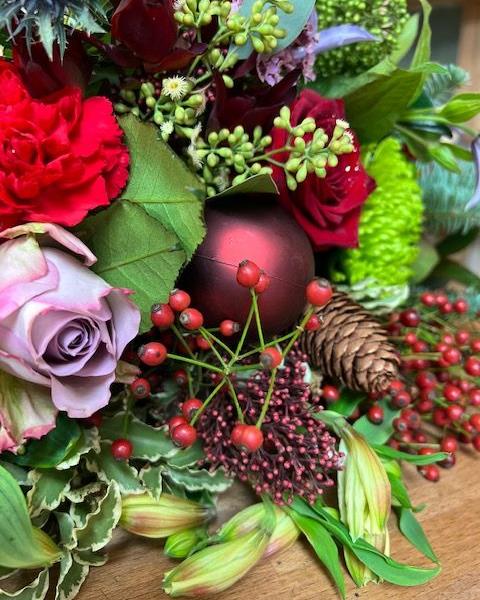 Christmas themed hand-tied bouquet in water, wrapped in lovely, quality and tasteful Christmas paper