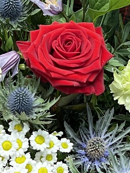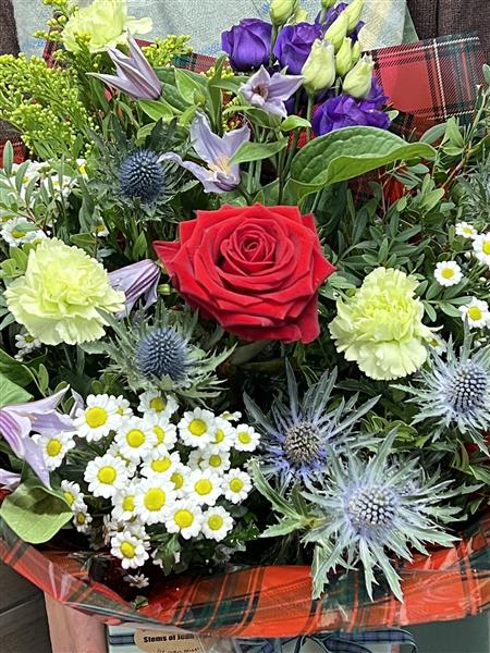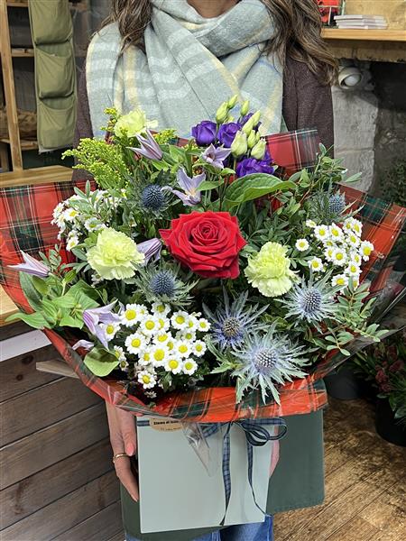 A lovely Scottish themed handtied, Thistles, purples, lilacs and whites with a hind of Rabbie Burns " O My luve is like a red, red rose". Delivered in water with tartan wrapping and bow in a gift box ready for display.