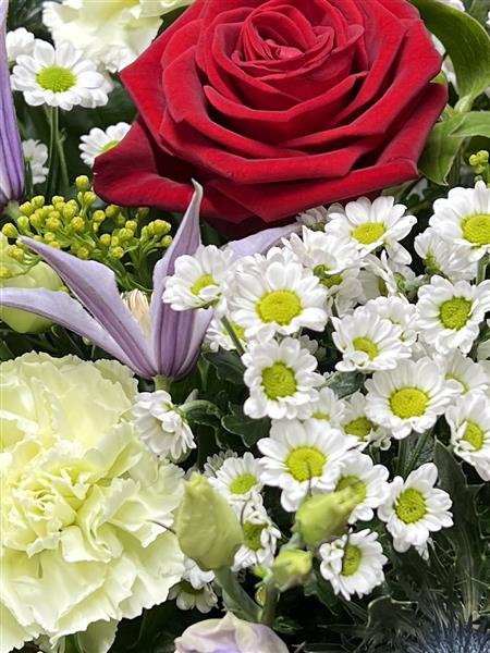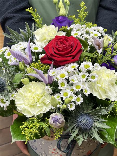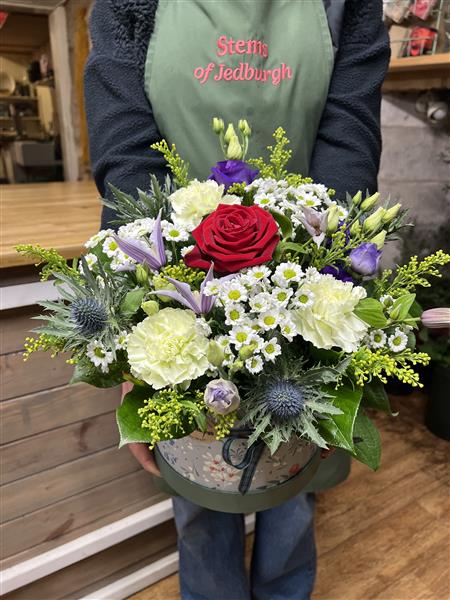 A lovely hatbox filled with flowers reminiscent of Scotland. With Thistles, Lilacs, purples and Whites and a nod towards Rabbie Burns with a single red Rose "O my luve's like a red, red rose"