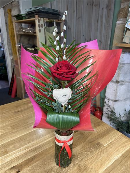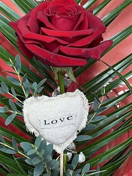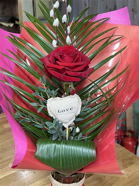 Single Red Naomi Rose with palm, pussy willow, aspidistra and eucalyptus with a Love pick, arranged in a nice green vase ready for display. A lovely gift