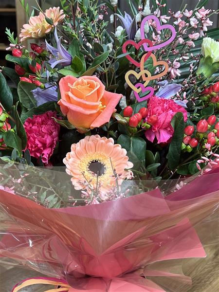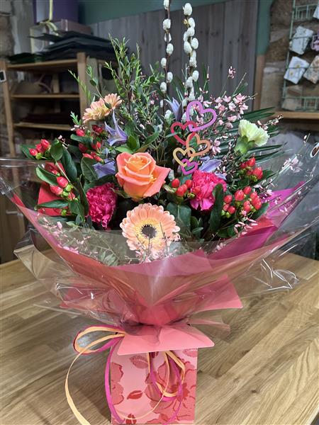 A lovely Handtied in water ready to display. Not over the top Valentines, just a nice mix