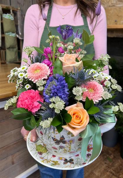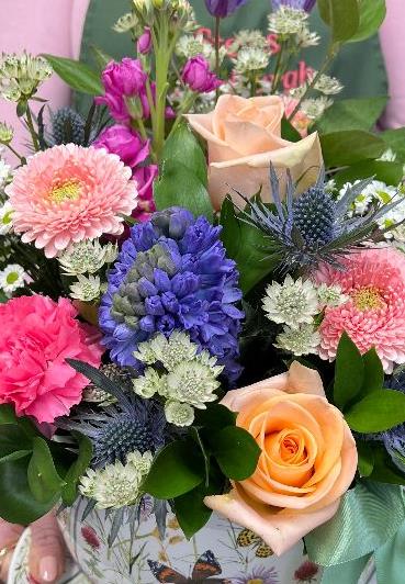 Mums will love this rather large t-cup full of flowers. Roses, germini, carnations, hyacinth, stocks with astrantia and thistle. Just beautiful. Flowers arranged in flower foam ready for display. t-cup can be reused after with plants in.
