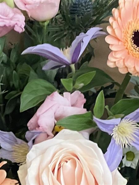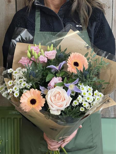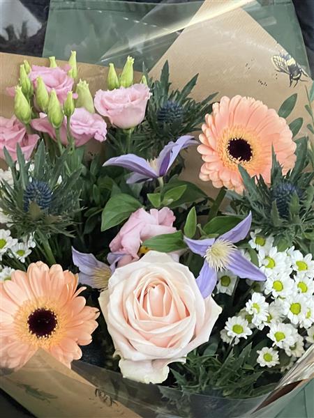 A lovely pastel tied bouquet suitable for most occasions. Subtle germinis, Clematis, Rose, lisianthus and Thistle are just perfect as a thank you, Congrats, happy birthday, Happy anniversary or a thinking of you. Tied and gift wrapped these beautiful flowers just need to be recut after removing the wrapping and placed in a vase to look stunning!