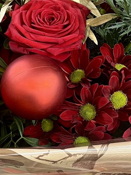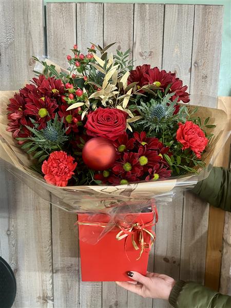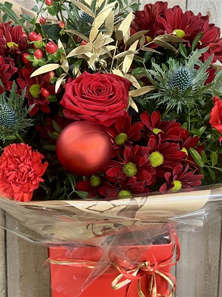 Traditional Reds and golds. Long lasting Chrysanths, Carnations, Thistles, hypericum Berries, Red Rose with foliage.