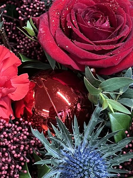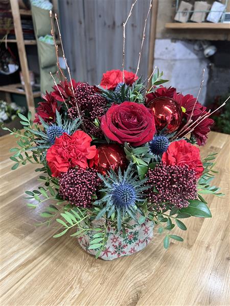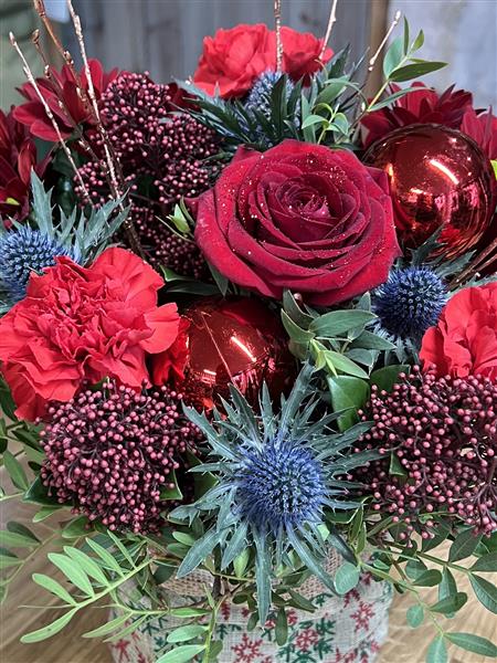 Hessian bag full of Reds and blue flowers for Christmas ready arranged for instant display