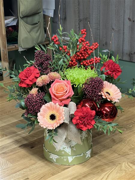 Lovely Green Hatbox full of red and peach flowers ideal for a December gift . This is arranged in floral foam and is ready to display