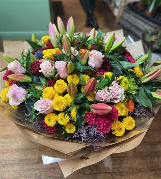 If you want the wow factor this bouquet will do it!! A lovely mix of vibrant and pastels , inc roses, Lilies, Gerberas and other lovely flowers from that days selection.