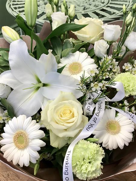 Classic all white bouquet with Thinking of You ribbon. White oriental Lily,Lisianthus, Roses, Germini, Wax flower and subtle lime Carnations come together to create a stunning selection. Simple wrapping and box make this an understated piece, ideal as a sympathy gift.