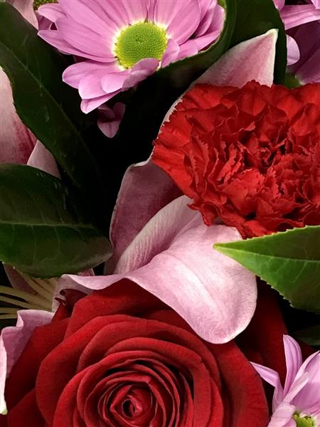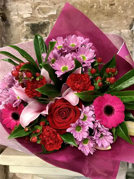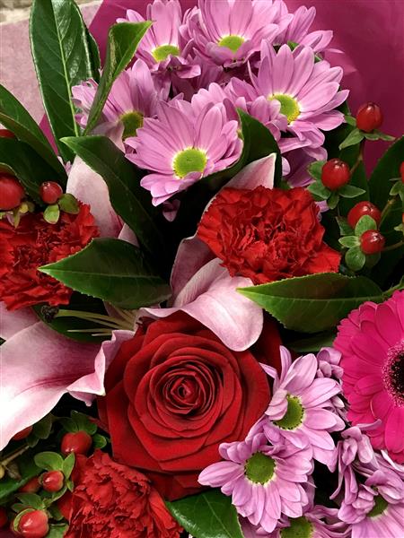 A mixed selection of flowers inc I red roses. Colours used could be pinks, reds, limes or whites . We will create a lovely bouquet full of love.
