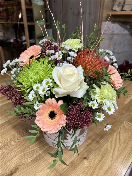 Winter style hatbox filled with pastels, green and a touch of red . This is an arrangement in floral foam ready for display