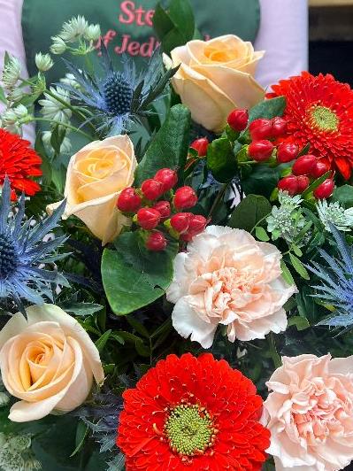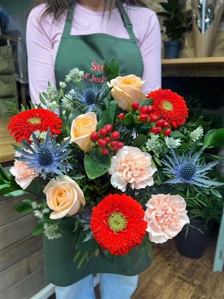 germini, roses, thistle, carnations, hypericum berry and astrantia flower combined make this a lovely bouquet.